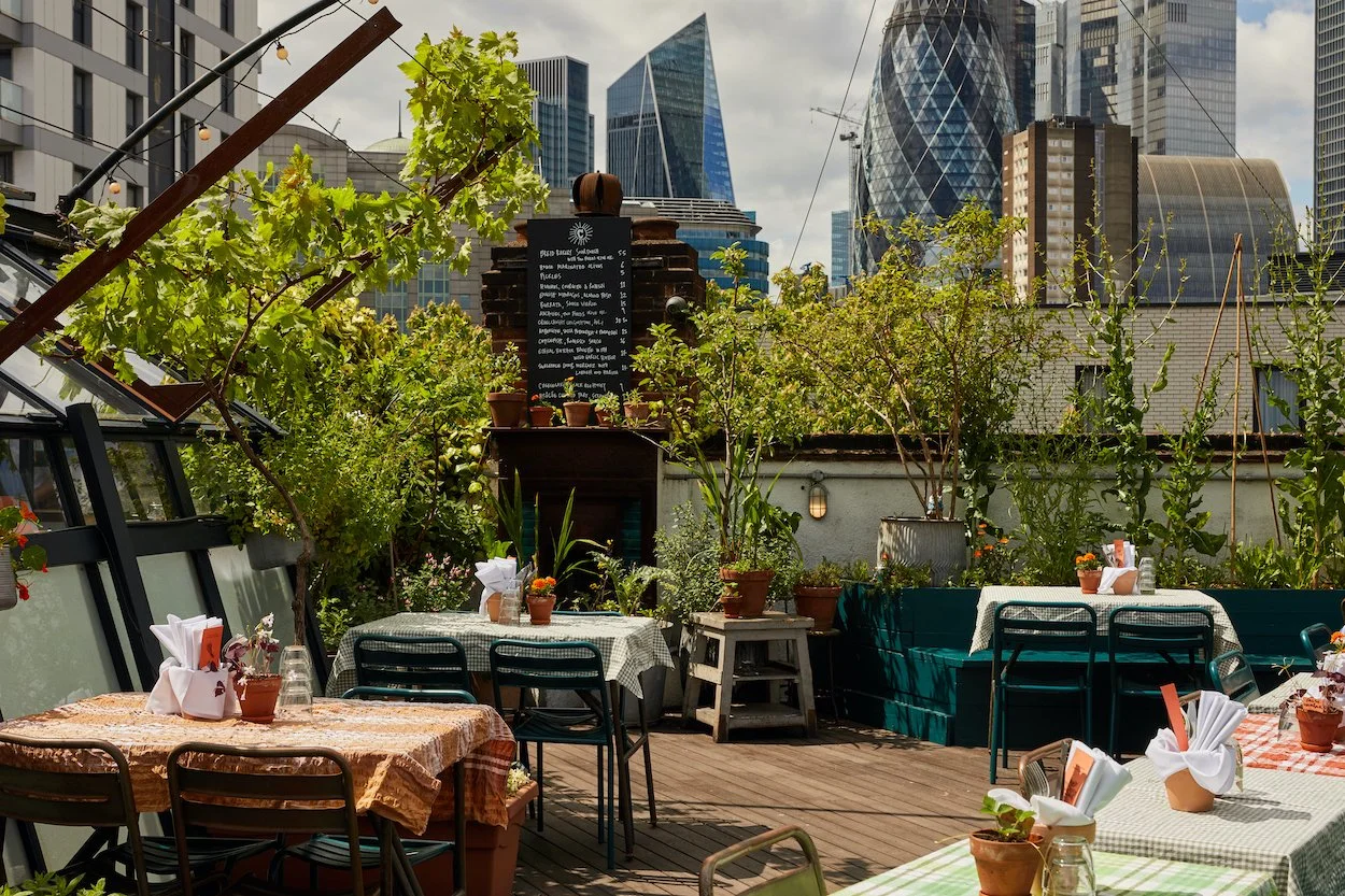 In 2025, we redesigned and replanted the space, transforming it into a rooftop woodland. Guests now sit among birch and hazel trees, with amelanchier and crab apple adding height and structure. Beneath them, a tapestry of berries, grasses, ferns, mints, woodruff, and wild strawberries creates layers of texture and scent. With a perennial, woodland-inspired planting scheme, this low maintenance garden is designed to evolve and mature over time